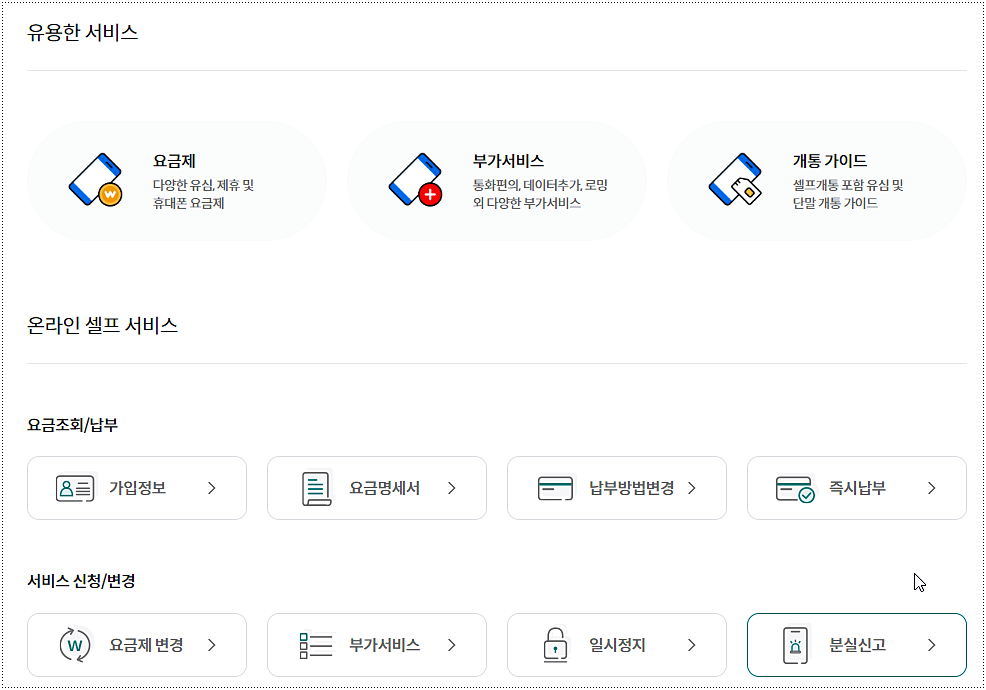 휴대폰을 분실했을 때는 어떻게 하나요? | 고객센터(114/1899-5000)나 홈페이지에서 즉시 분실신고 및 사용정지가 가능합니다. |