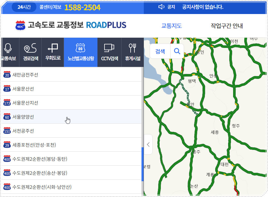 처음 로드플러스에 접속하면 전국 고속도로 지도가 한눈에 보입니다. 지도 화면에서 강원도 방향을 보면 서울에서 양양까지 이어지는 노선이 표시됩니다. 이 노선이 바로 서울양양고속도로입니다. 그리고 노선별교통상황 메뉴로 들어가서 ‘서울양양고속도로’를 클릭하면 구간별 교통상황이 색상으로 표시됩니다. 초록색은 원활, 노란색은 서행, 빨간색은 정체를 의미합니다. 이 색상만 봐도 현재 상황을 빠르게 파악할 수 있습니다.