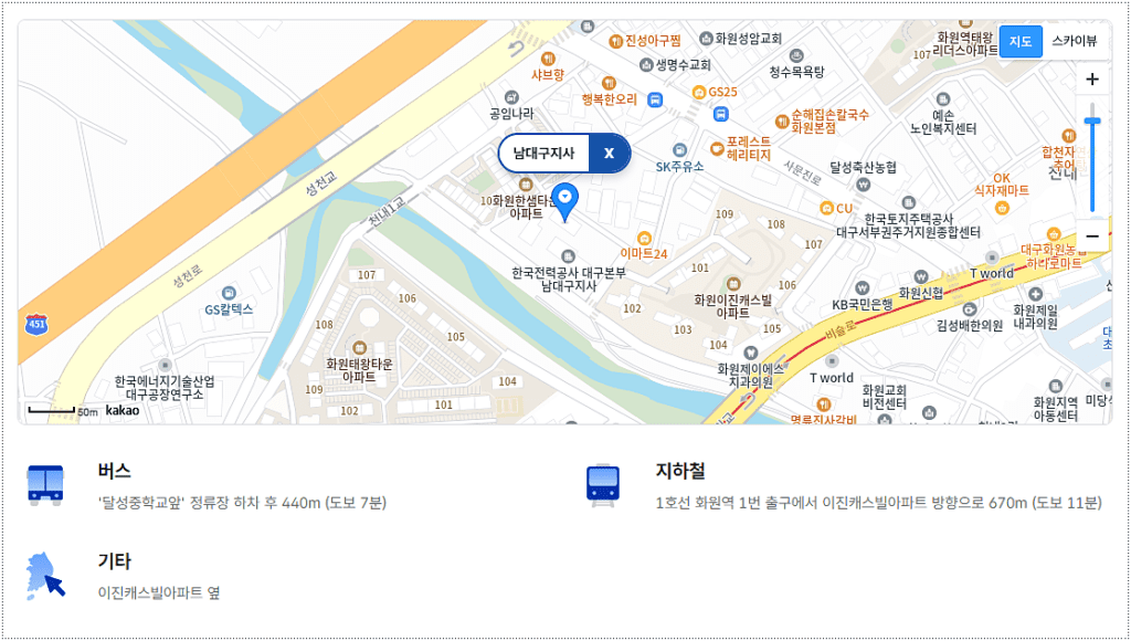 먼저 가장 많이 찾는 기본 정보부터 정리해볼게요. 주소와 위치를 먼저 살펴보면, 주소는 대구광역시 달성군 화원읍 비슬로 509길 26입니다. 대중교통 접근성도 나쁘지 않은 편이라 자차가 없어도 충분히 갈 수 있어요. 남대구지사는 화원이진캐스빌아파트 옆에 위치해 있습니다.